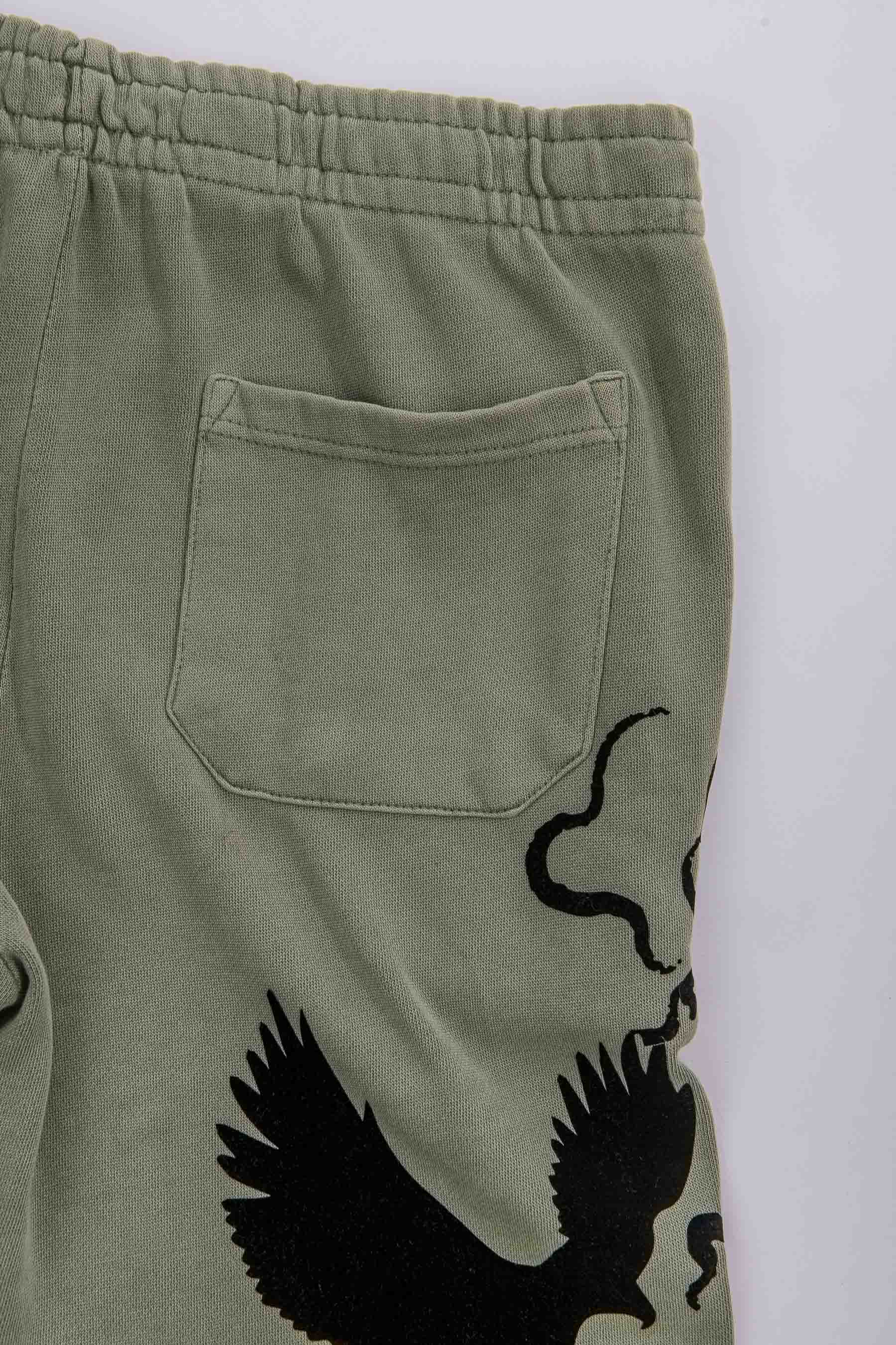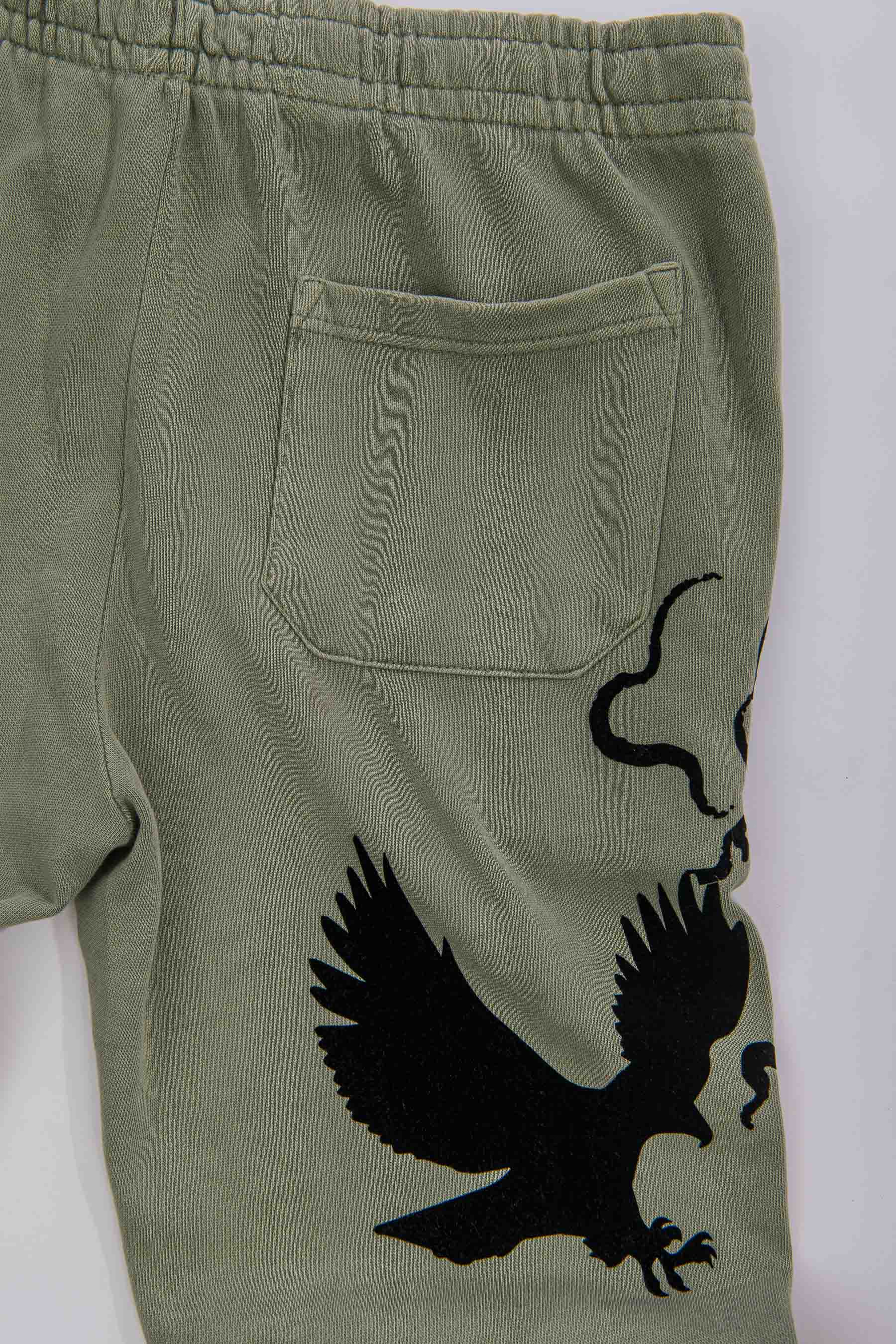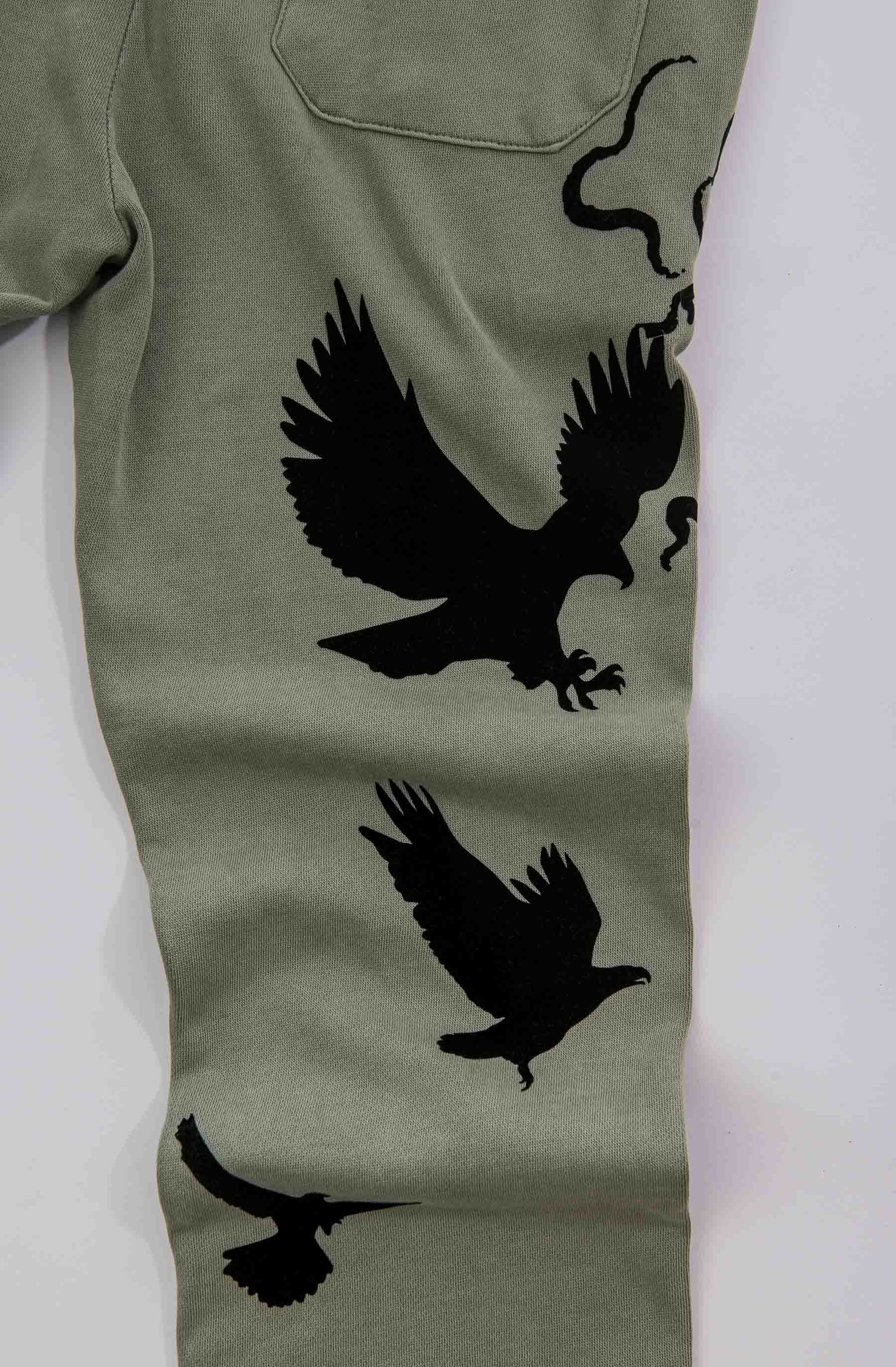 Details: Striking black raven graphics on both legs; back pocket for functionality