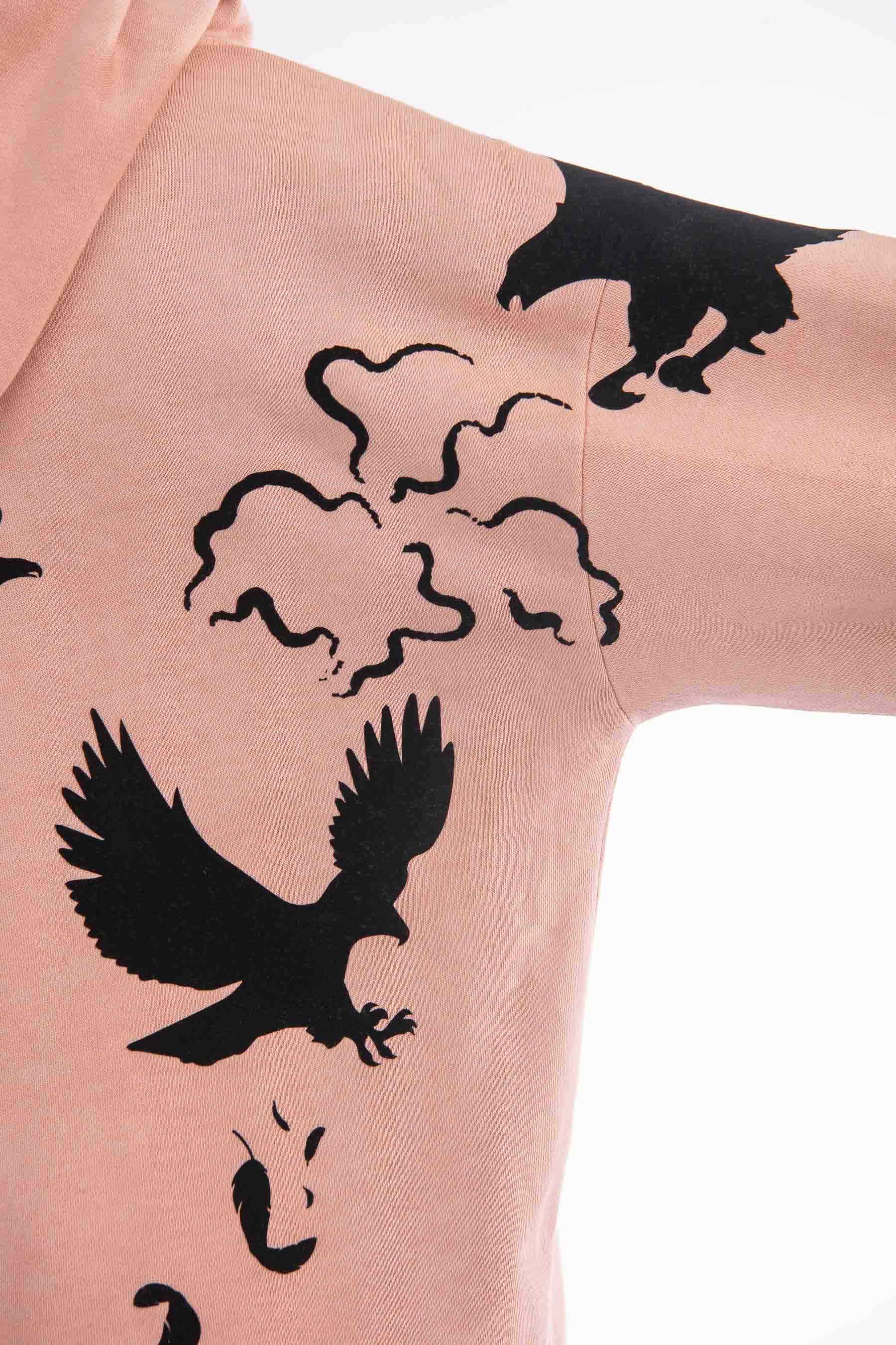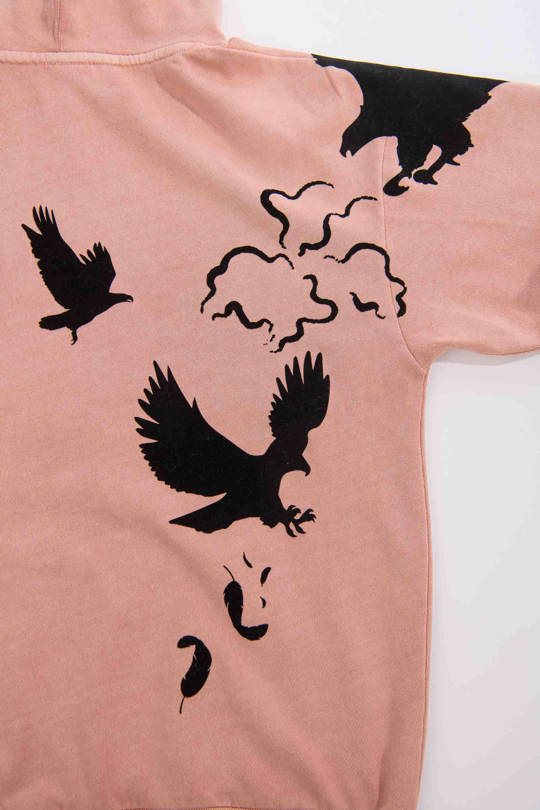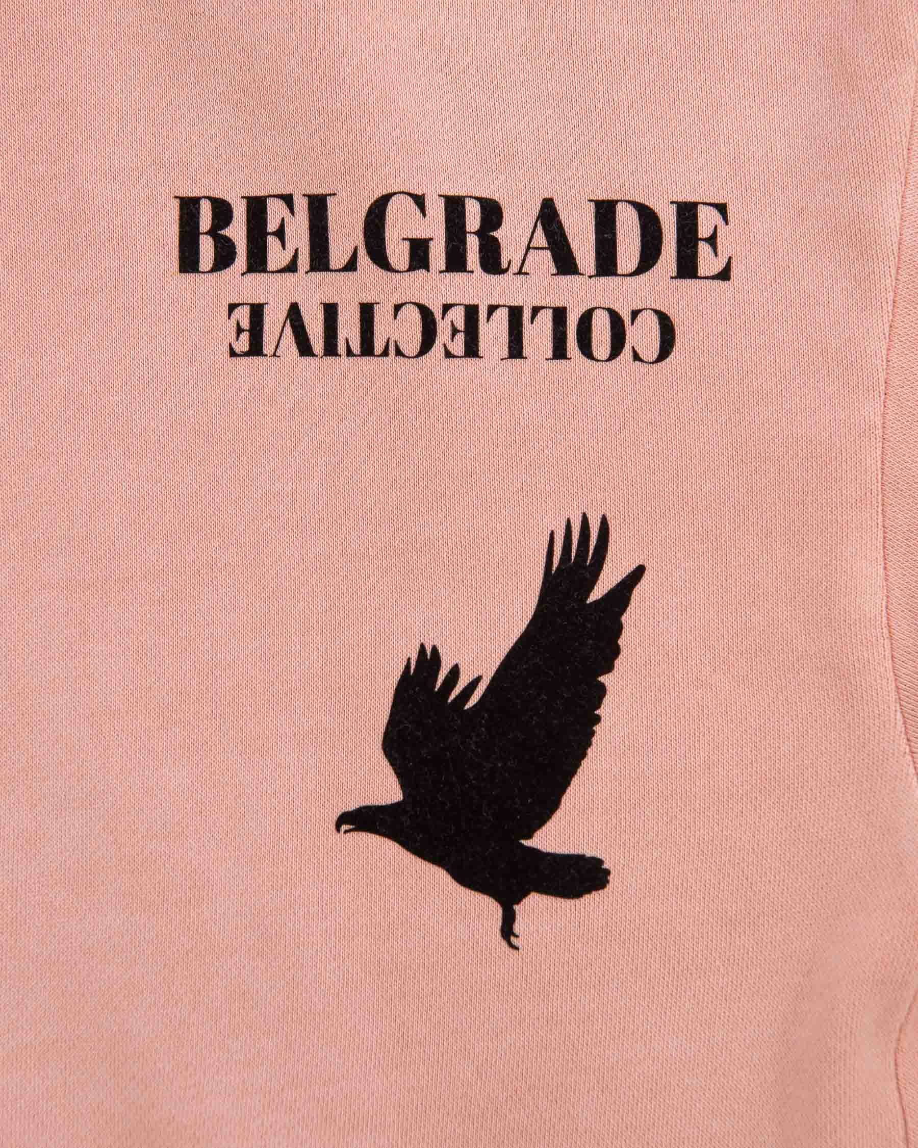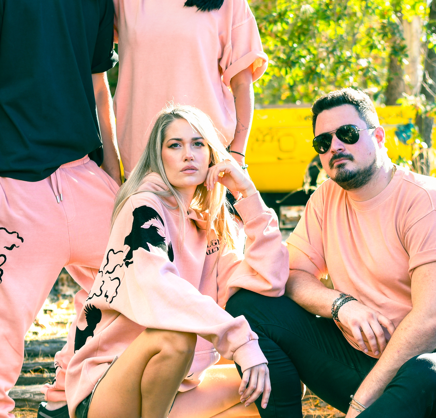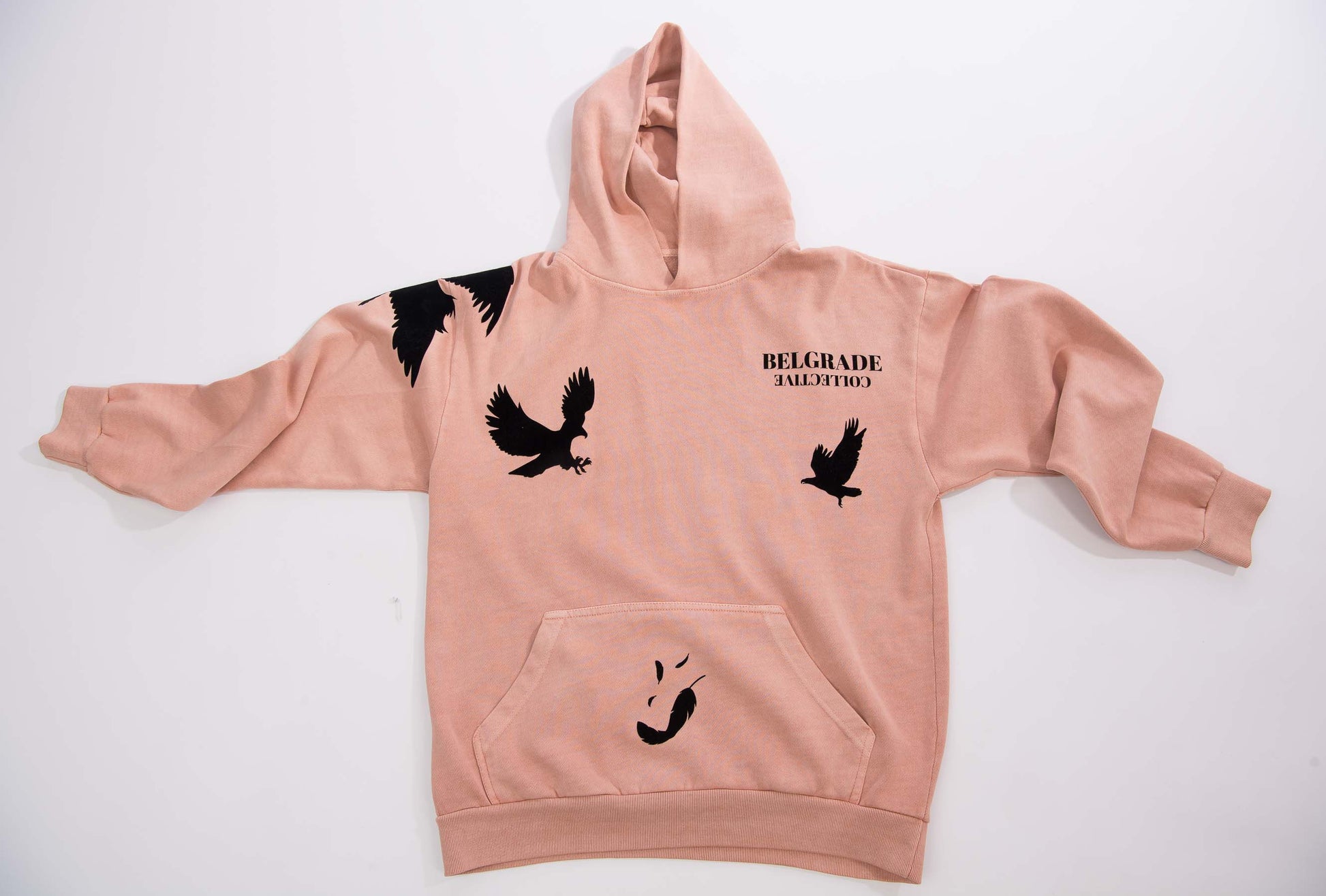 The hoodie pictured in the LACHS (soft peach-pink) tone is a signature piece from the POBEDNIK Collection.